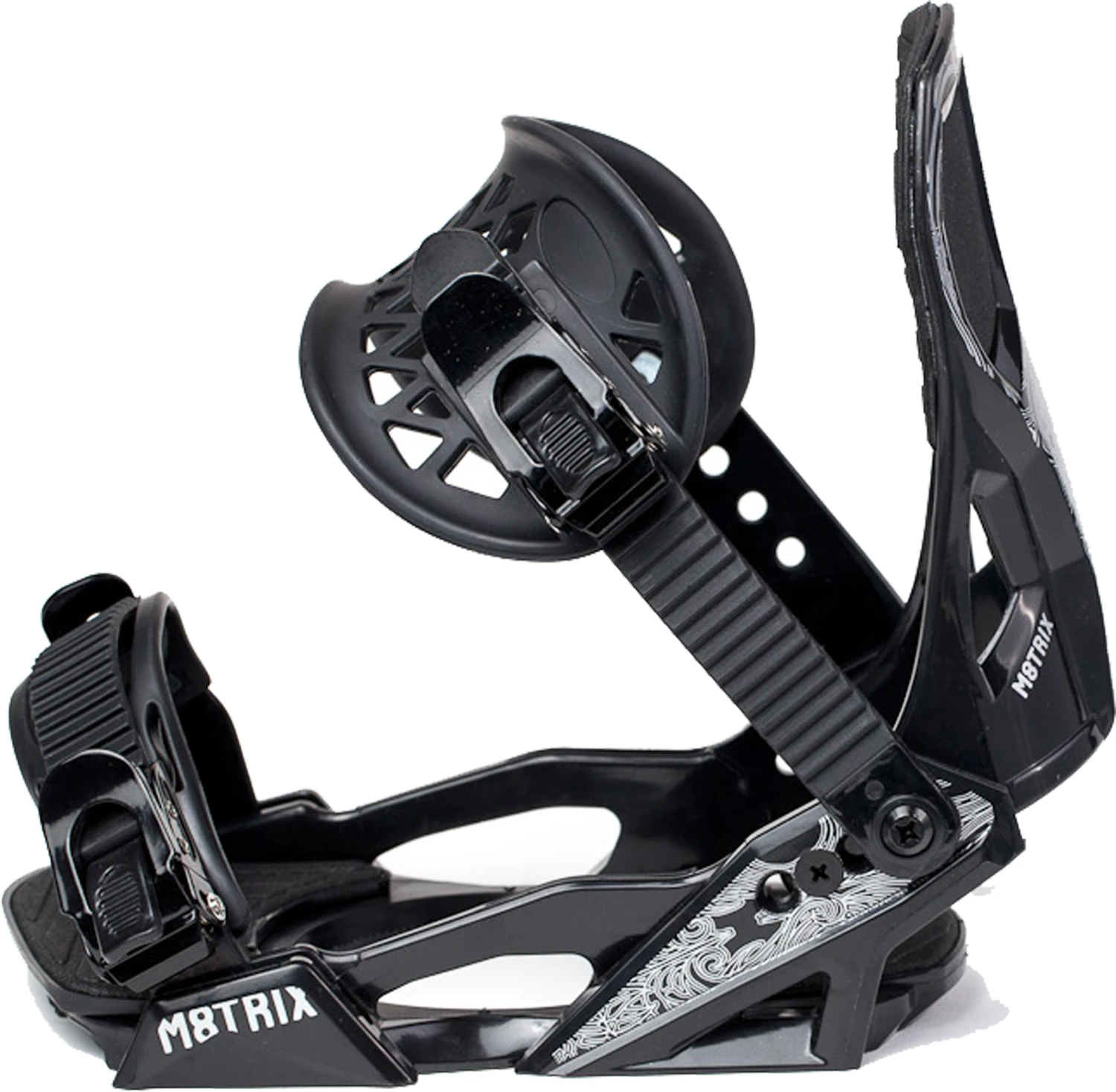 Newly designed Thermoplastic resin (TPR) ankle straps to provide more even pressure and hold the boots more securely in the heel pocket. The mesh design prevents snow from building up behind the strap. The TPR toe strap flexes over the toe like a rubber band to maintain more secure pressure. Adjustable toe ramp. EVA padded highback and base. Nylon frame. Metal ratchets. Silkscreen graphics. EVA padded highback and base. Nylon frame. Metal ratchets. Silkscreen graphics.
